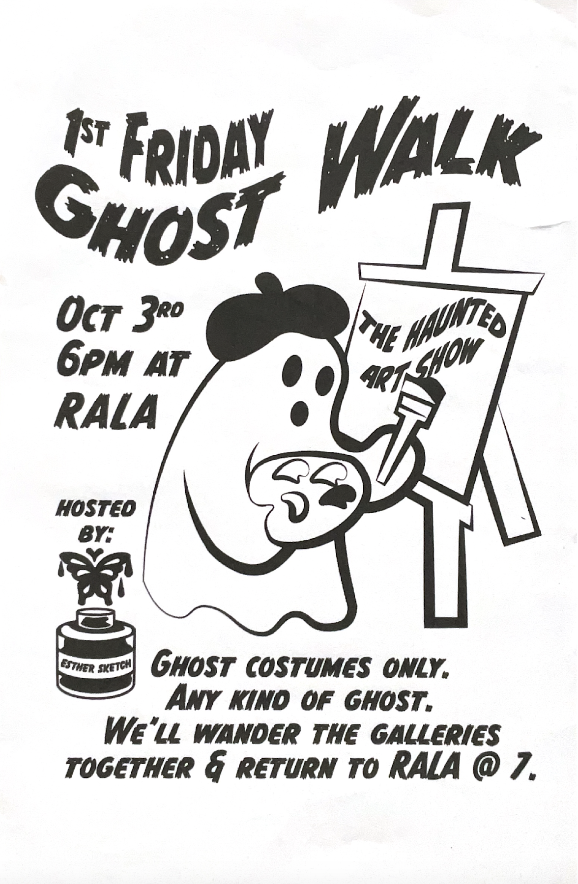 Meet at RALA for the first ever First Friday Ghost Walk, led by Esther Sitver. Dress as a ghost and wander the First Friday ArtWalk galleries together and return to RALA at 7 PM to see the Haunted Art Show!