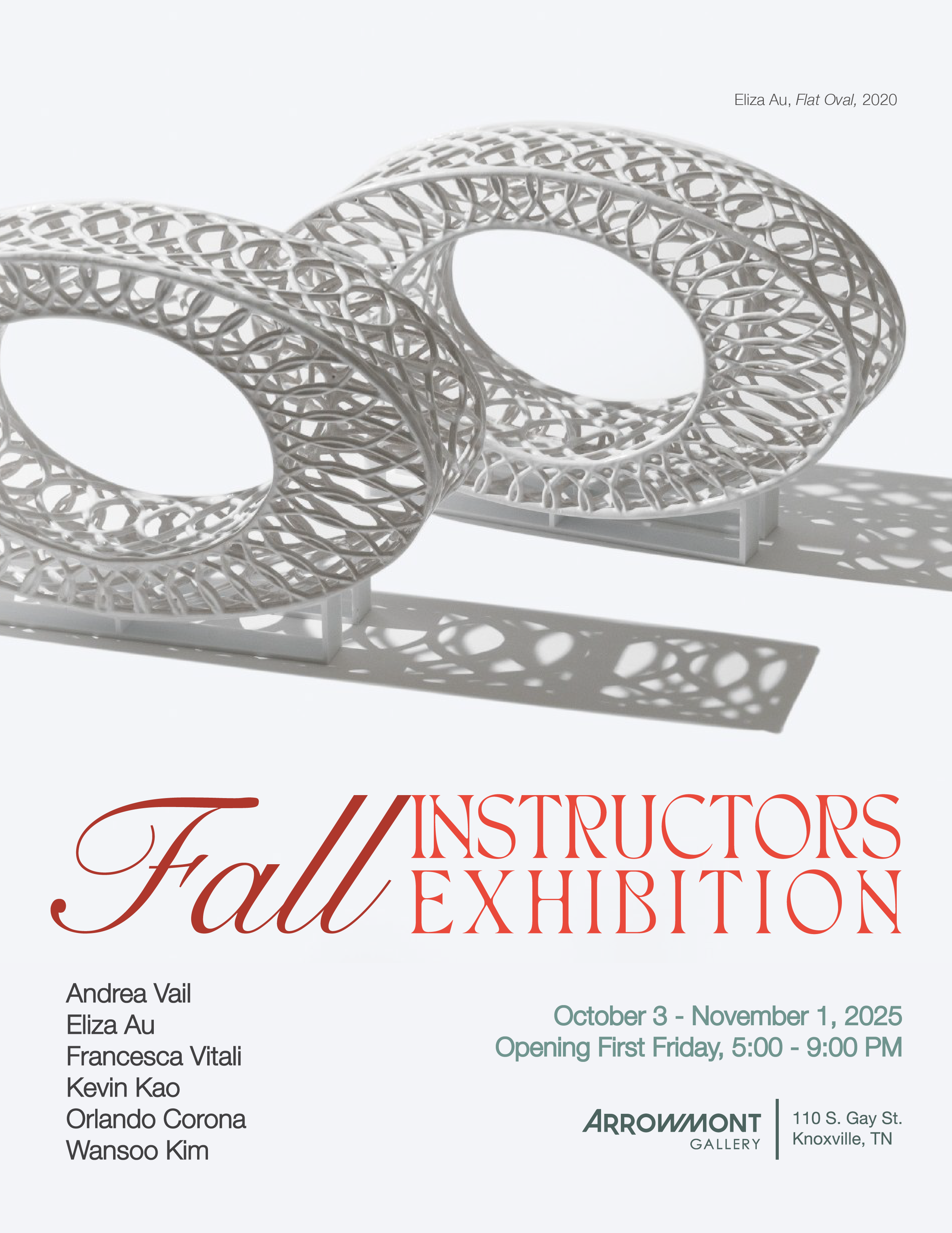 The Fall Instructors Exhibition features work by select instructors teaching national workshops at the Arrowmont School of Arts and Crafts during October or November, including Andrea Vail, Eliza Au, Francesca Vitali, Kevin Kao, Orlando Corona and Wansoo Kim. Exploring a range of two and three-dimensional processes, these six artists engage in themes spanning history, culture, identity, and the everyday. The exhibition will open First Friday and be on view from through November 1, 2025.