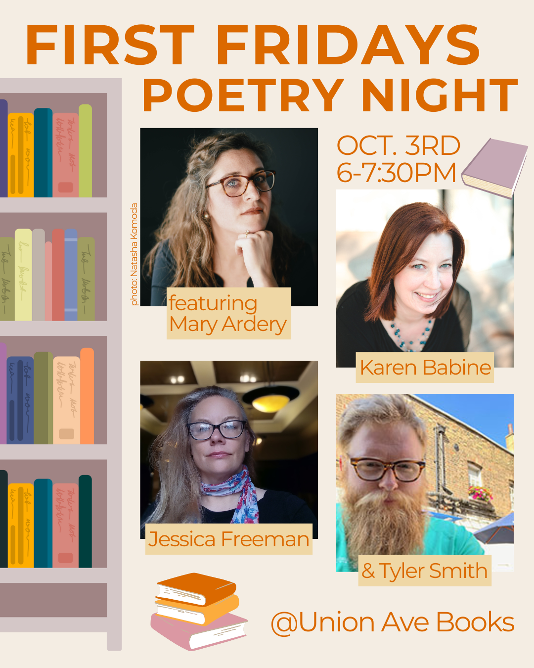 Union Ave Books is excited to present a Poetry Night in celebration of First Fridays, featuring Jessica Freeman, Tyler Smith, Karen Babine, and Mary Ardery. Both Karen Babine and Mary Ardery have new books that we're celebrating! RSVP for this FREE event by visiting unionavebooks.com/events.