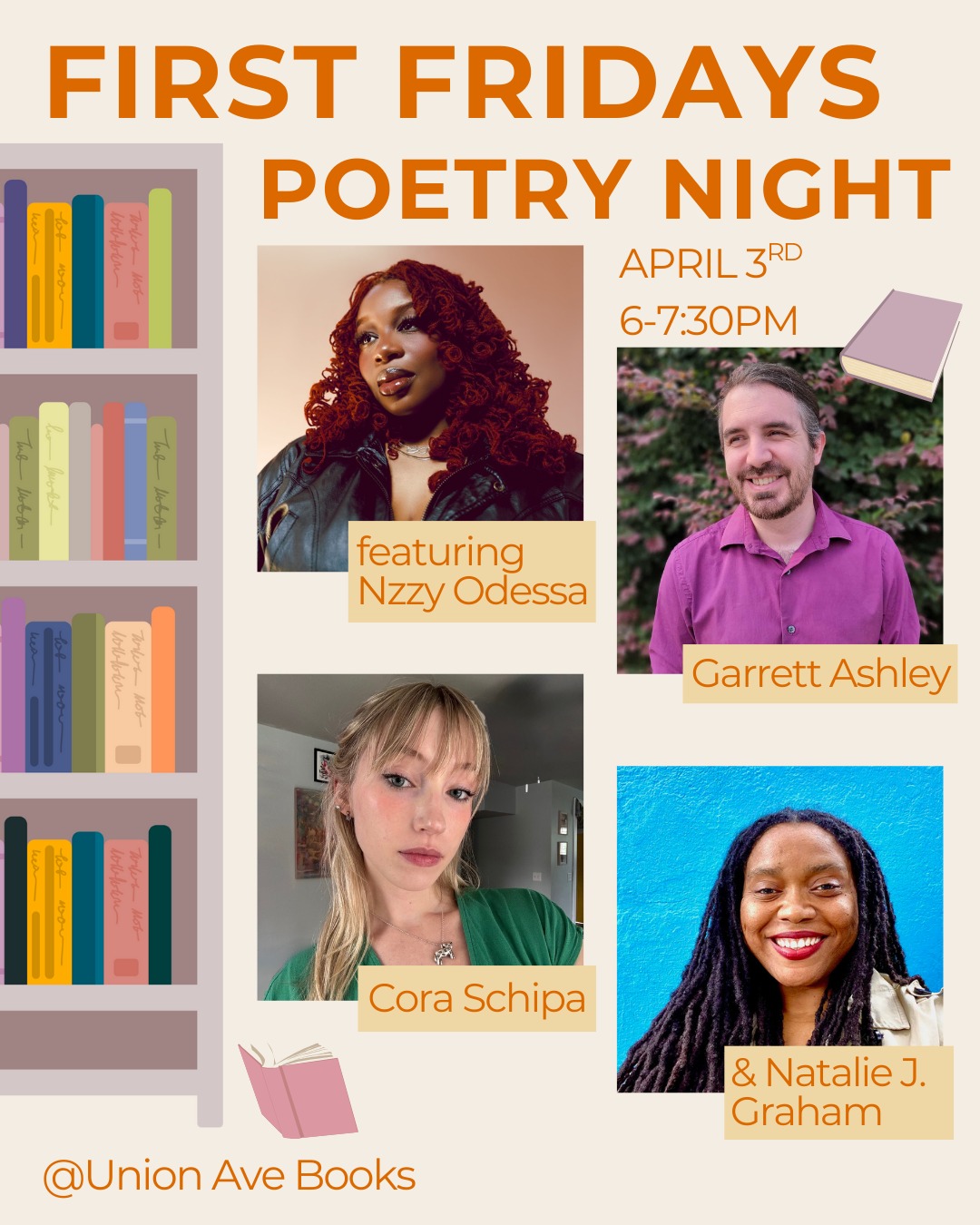 Union Ave Books is excited to present a Poetry Night in celebration of First Fridays, featuring Garrett Ashley, Natalie J. Graham, Nzzy Odessa, and Cora Schipa. RSVP for this FREE event by visiting unionavebooks.com/events.